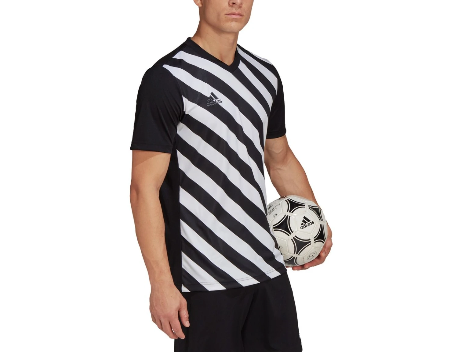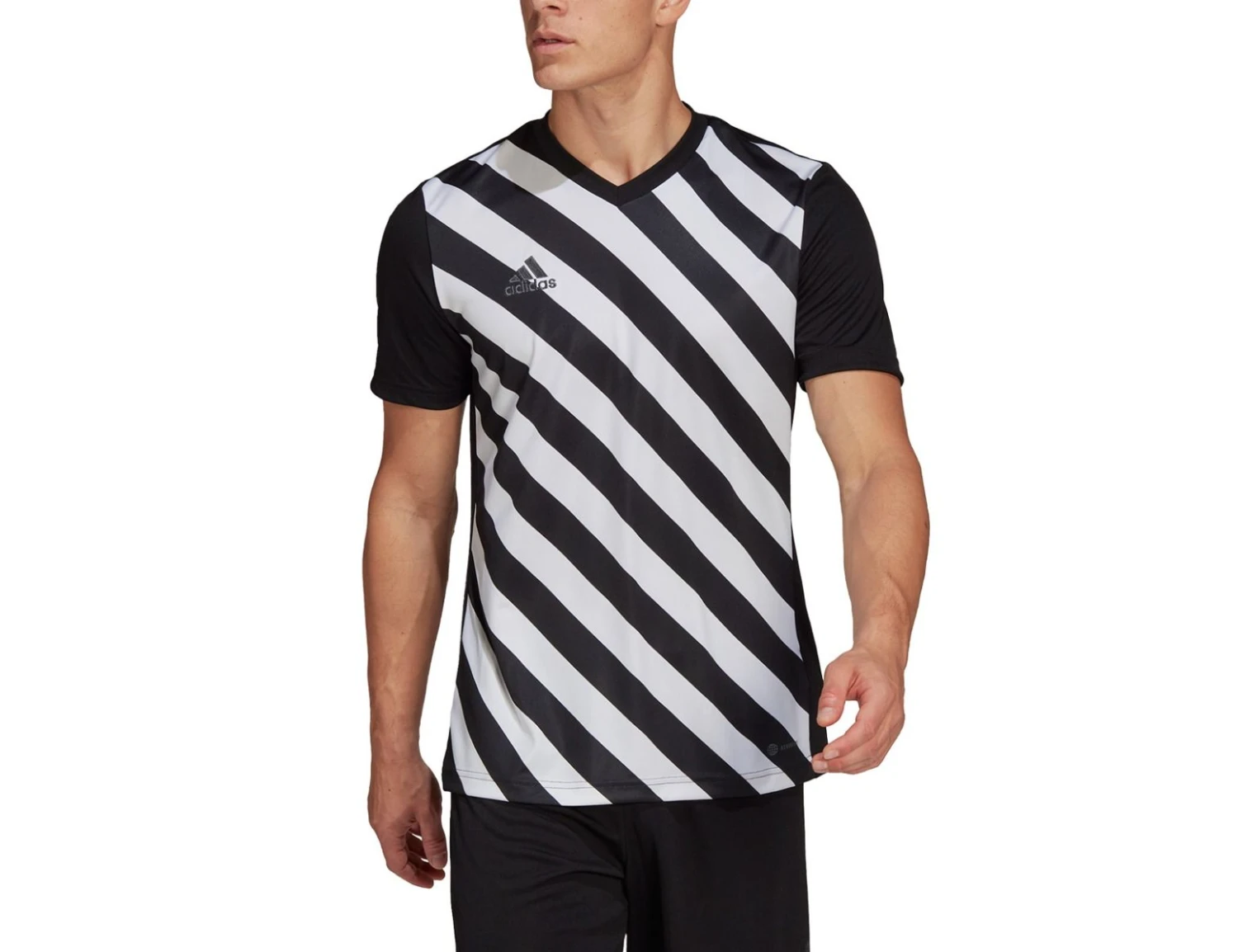 Das schwarz/weiße adidas Entrada 22 Graphic Herren Fußballtrikot ist ein klassisches Trikot. Das Trikot hat diagonale Streifen. Das Fußballtrikot ist aus feuchtigkeitsregulierendem AEROREADY Material, welches den Körper trocken hält, hat einen V-Ausschnitt und eine schmale Passform. Aus recyceltem Material.