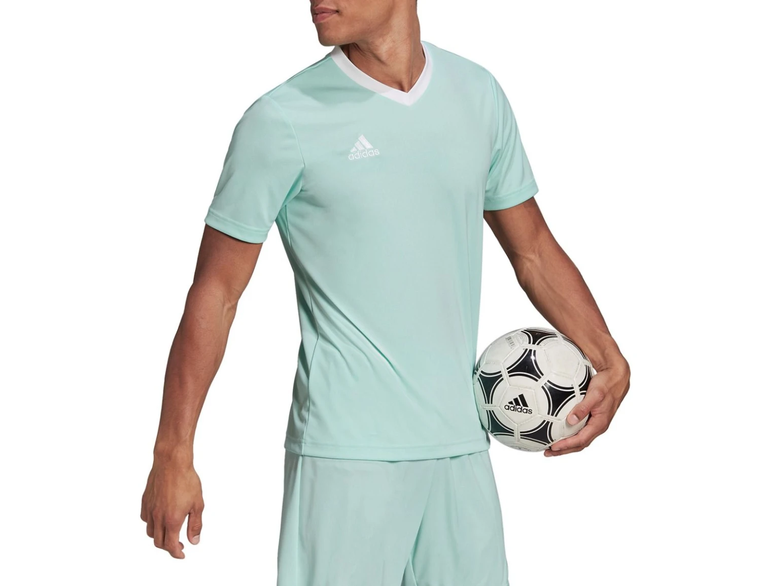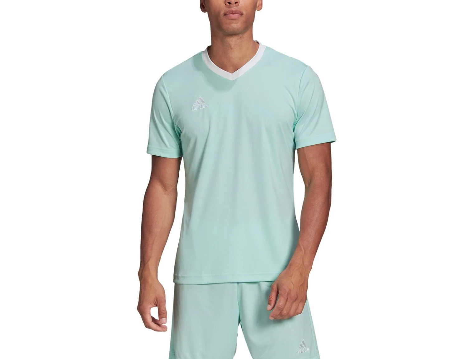 This mint green adidas Entrada 22 Jersey for men has a classic, minimalist design. The shirts are made with moisture-wicking AEROREADY material which keeps the body dry, the shirts also have a V-neck and an airy fit. Made with recycled material.