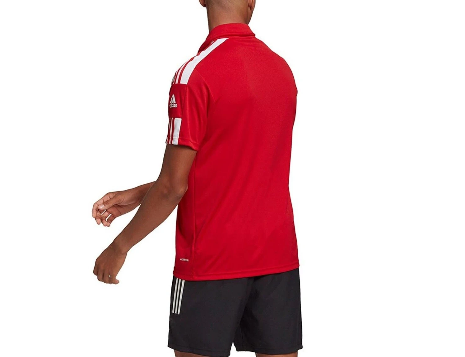 Rotes adidas Squadra 21 Poloshirt für Herren aus speziellem AEROREADY Material, welches den Körper trocken und kühl hält. Das Polo hat gestreifte Ärmel mit dem adidas Badge of Sports Logo und eine Knopfleiste auf der Vorderseite. Dieser Artikel wird mit Primegreen hergestellt, eine Reihe High Performance Materialien.