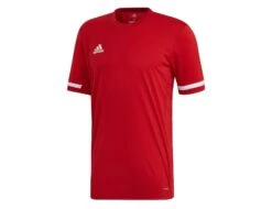 Rotes adidas T19 Sportshirt für Herren, aus speziellem AEROREADY Material welches den Körper kühl und trocken hält. Das Shirt hat weiße Streifen an den Ärmeln und Mesh Einsätze an den Seiten. Geeignet für viele Sportarten.