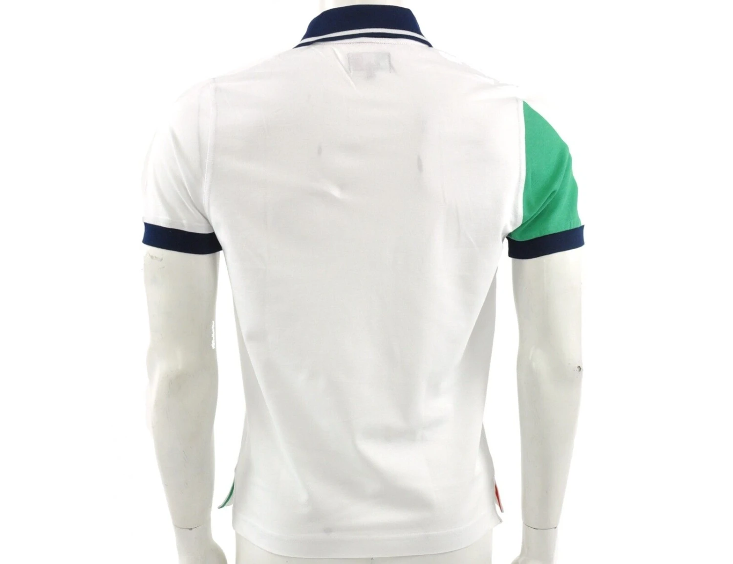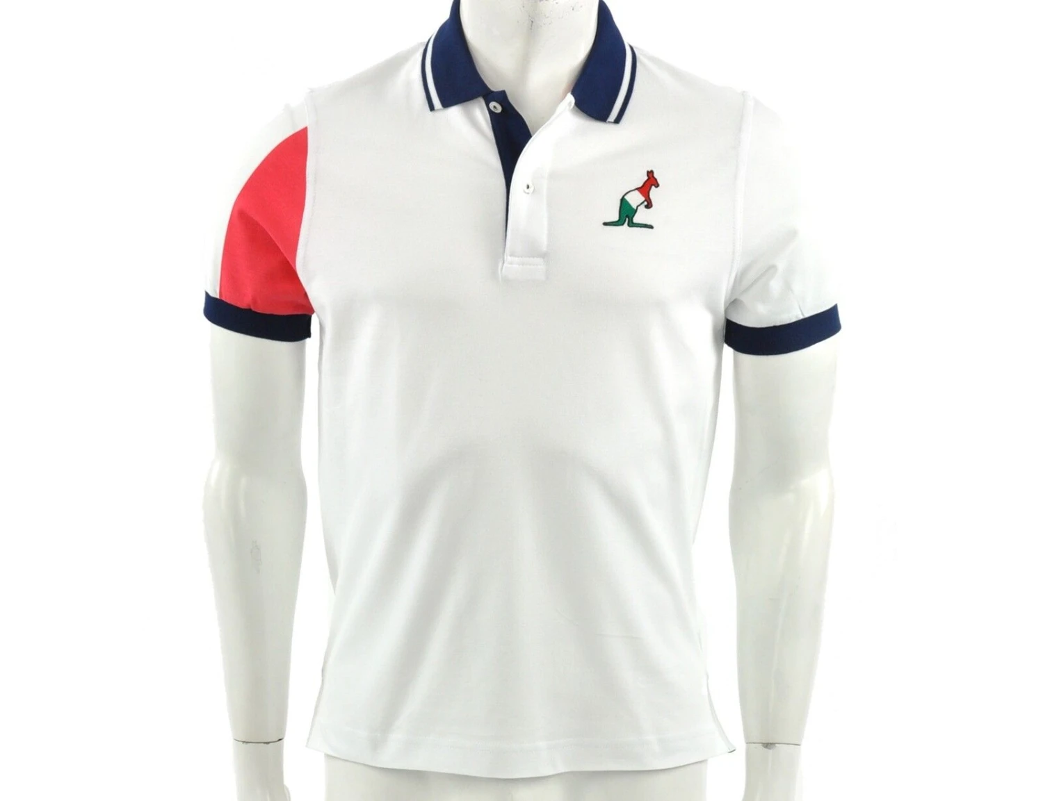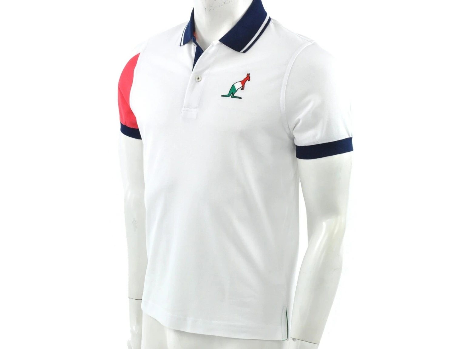 Weißes Australian Poloshirt mit dunkelblauen, grünen und roten Details für Herren. Das Poloshirt hat eine Knopfleiste auf der Vorderseite. Das Australian Logo auf der Brust ist in den Farben der italienischen Flagge. Der rechte Ärmel ist auf der Vorderseite rot und auf der Hinterseite grün. Am Kragen ist ein weißer Kontraststreifen.