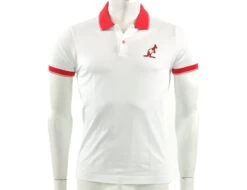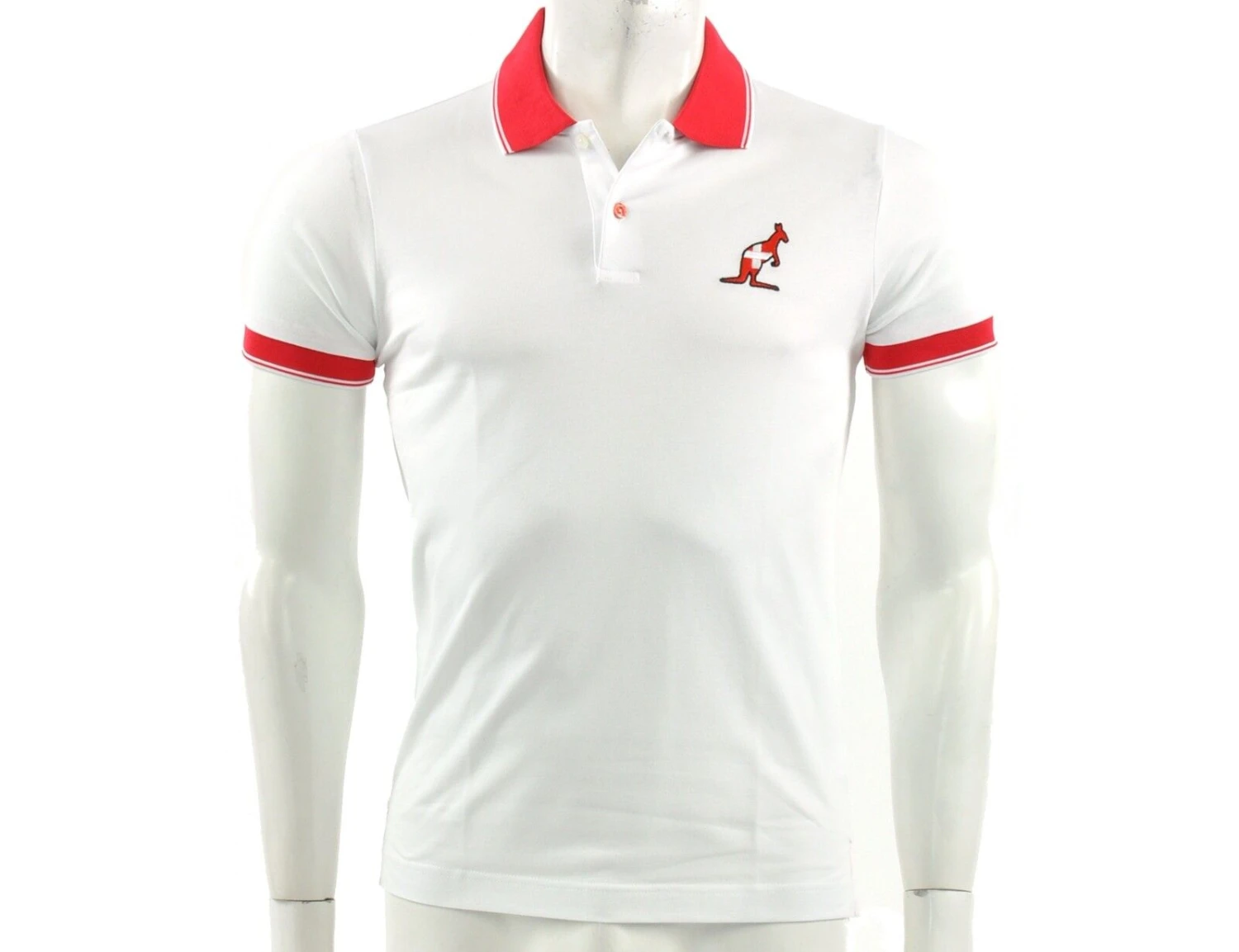 Weißes Australian Poloshirt für Herren. Das Poloshirt hat eine Knopfleiste. Am Kragen sind Kontraststreifen. Auf der Brust ist das Australian Logo in den Farben der schweizer Flagge.