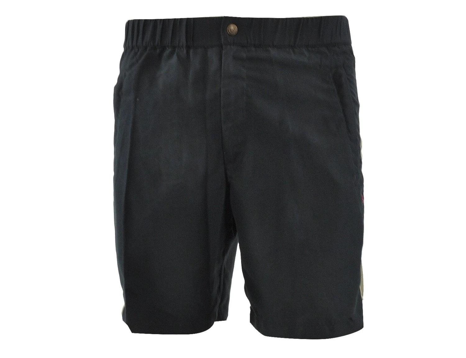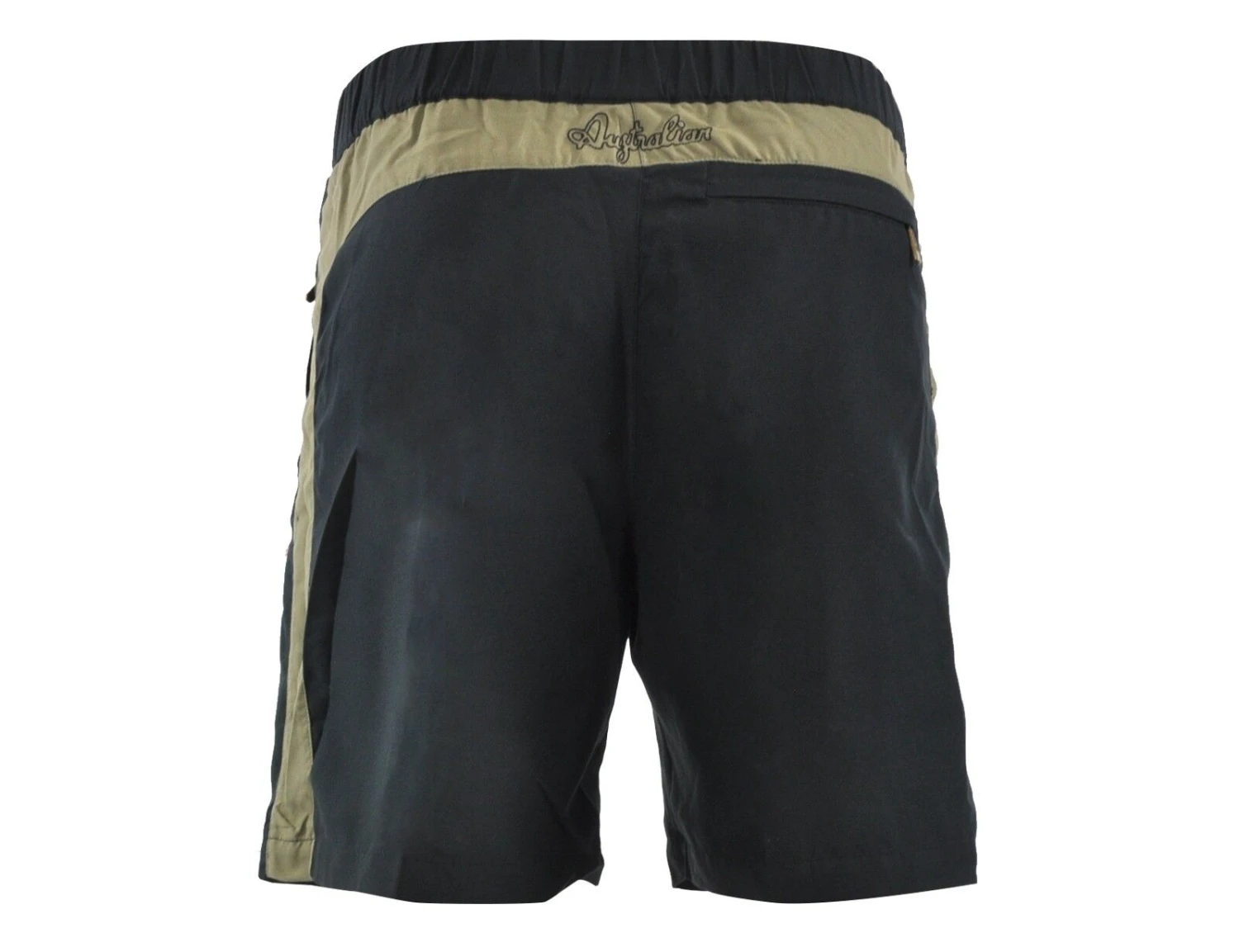 Schwarzer Short von Australian. Der Short ist aus 100% Polyester, hat eine normale Passform und Knielänge. Der Short hat einen grün/beigefarbenen Streifen an der Seite und auf der Rückseite. Elastischer Bund mit Kordelzug und Seitentaschen mit Reißverschlüssen. Das Australian Logo ist auf Vorder- und Rückseite.