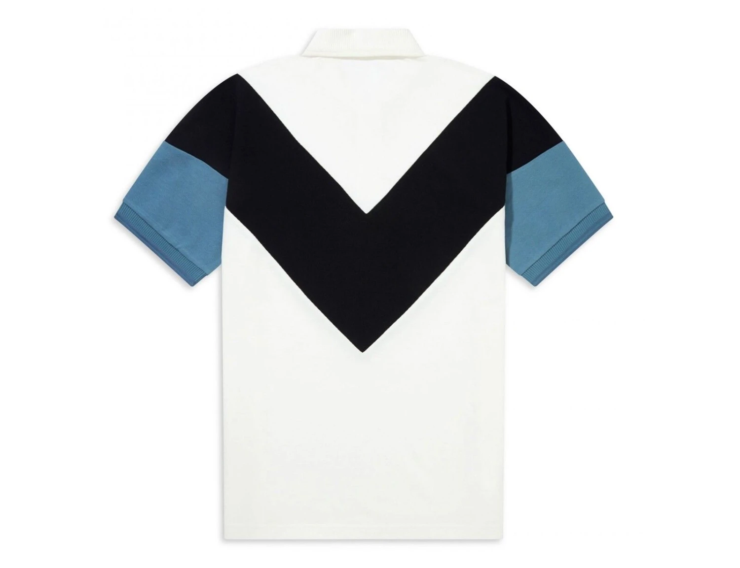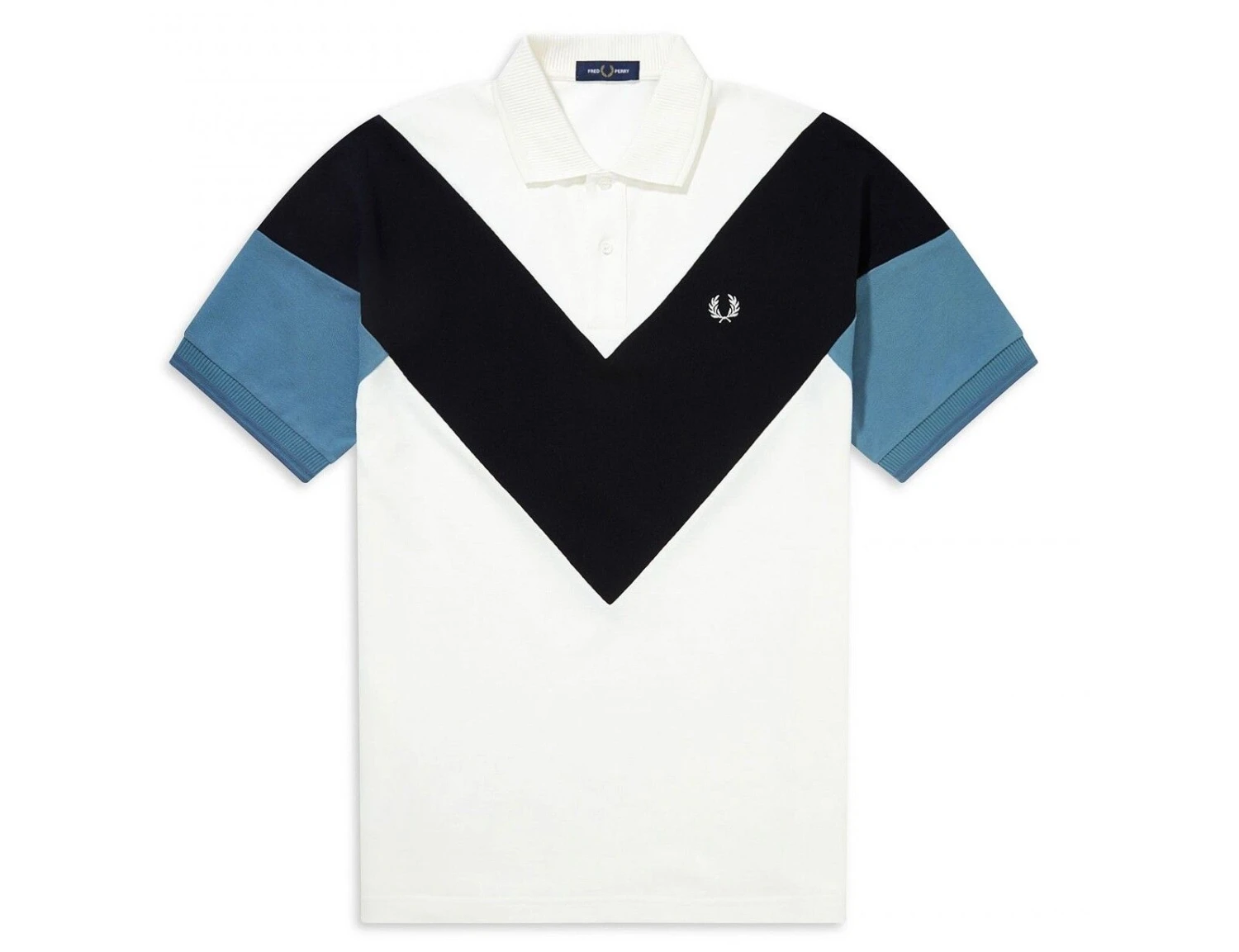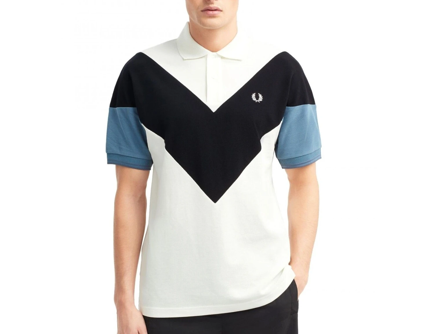 Baumwollpiqué Poloshirt von Fred Perry. Das Poloshirt hat ein Farbblock Chevron Design. Das Polo hat eine normale Passform und das Laurel Wreath Logo auf der Brust. Gerippte Ärmelbündchen, Bund und Ausschnitt.