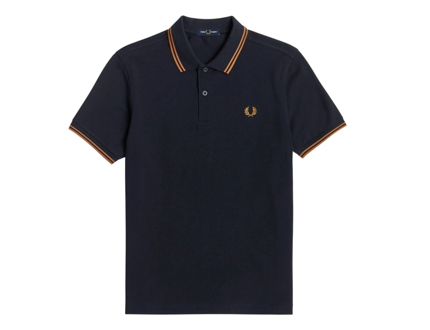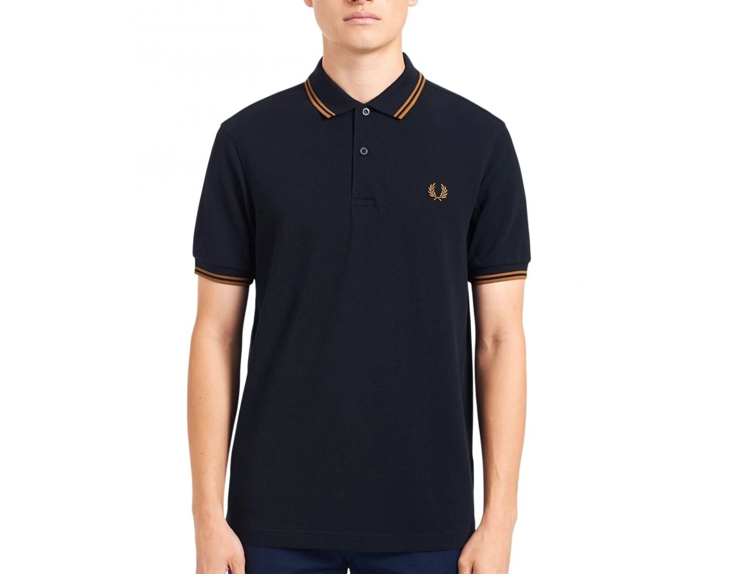 Das dunkelblaue Fred Perry M3600 Poloshirt ist aus Piqué Baumwolle. Das Polo hat einen gerippten Kragen, eine Knopfleiste und das Laurel Wreath Logo ist auf die Brust gestickt. Das Poloshirt hat eine schmale Passform. Am Kragen und an den Ärmelbündchen sind goldfarbene Streifen.