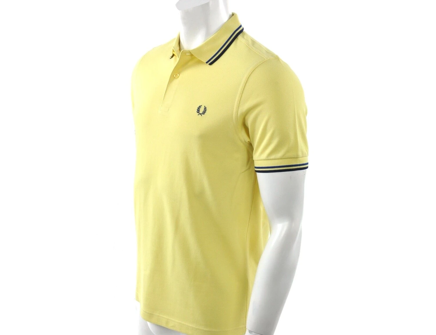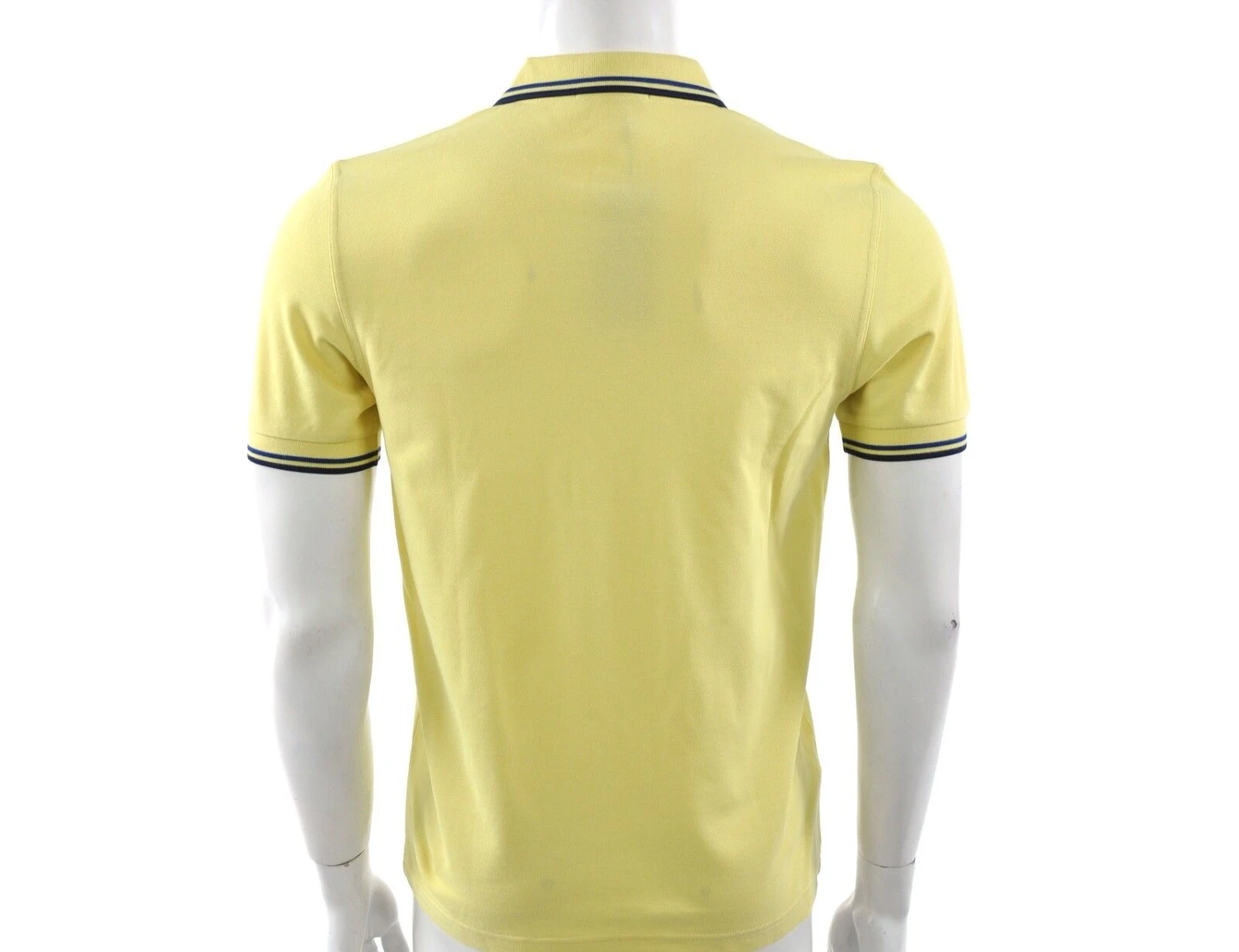 Baumwoll Pique Poloshirt von Fred Perry in der Farbe Gelb. Das Polo hat je zwei dunkelblaue Streifen am Kragen und an den Ärmelbündchen. Das Laurel Wreath Logo ist auf der Brust. Das Polo hat einen gerippten Kragen und eine Knopfleiste. Größe: S: Länge 70cm, Weite 47cm M: Länge 73cm, Weite 50cm L: Länge 73cm Weite 54cm XL: Länge 76cm Weite 59cm XXL: Länge 76cm Weite 62cm