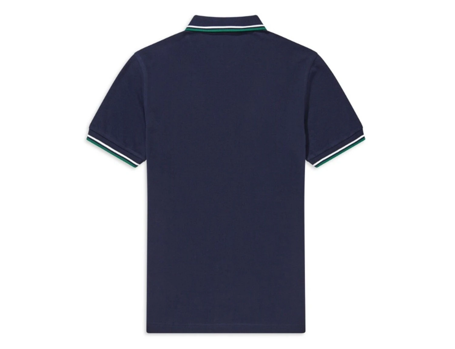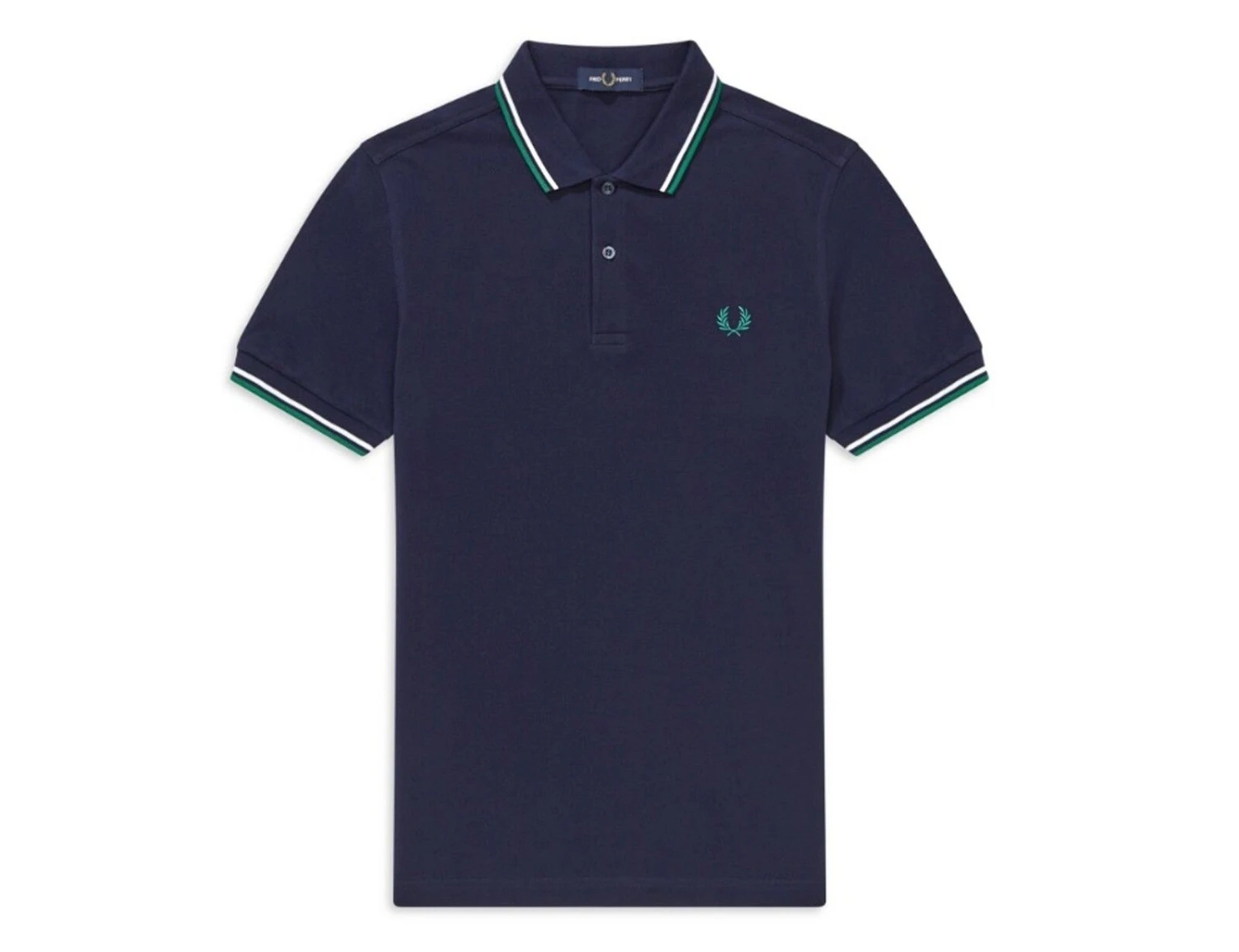 Herren Poloshirt von Fred Perry. Das Twin Tipped Polo hat ein gesticktes Laurel Wreath Logo auf der Brust. Am Kragen und an den Ärmeln sind Streifen. Das Poloshirt hat eine Knopfleiste und eine normale Passform.