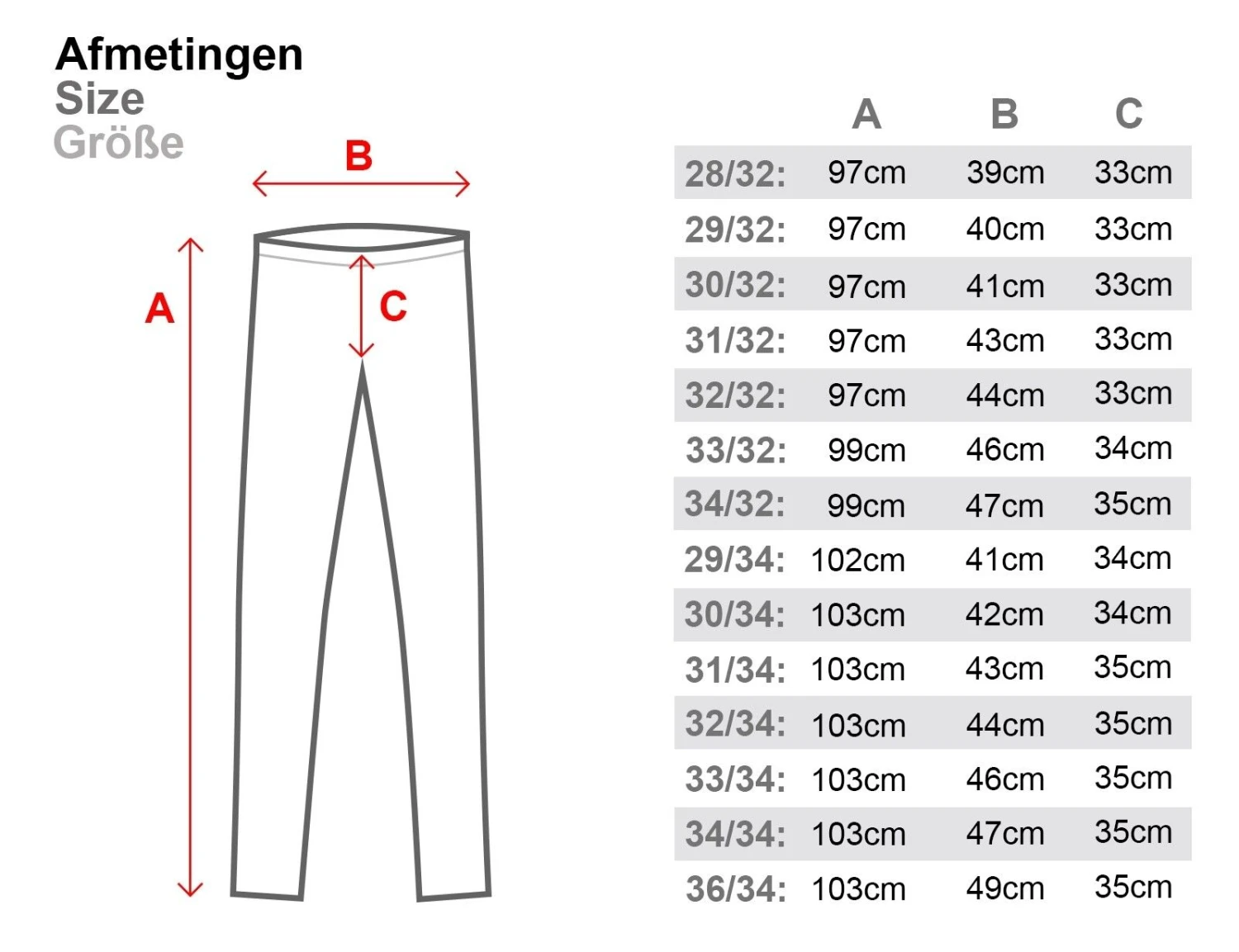| Größe | 28/"32, 29/"32, 29/"34, 30/"34, 31/"34, 32/"32, 32/"34, 33/"32, 33/"34, 34/"32 |