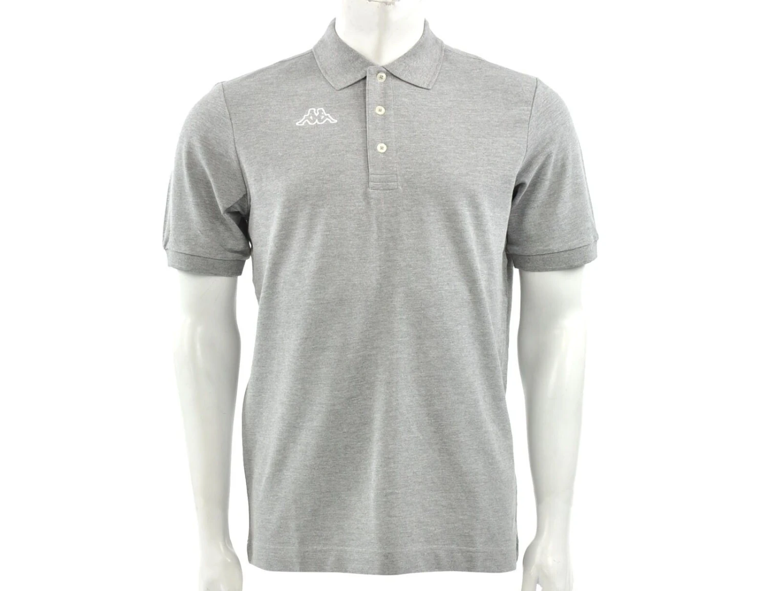 Graues Poloshirt von Kappa. Das Poloshirt ist aus 100% Baumwolle und hat eine normale Passform. Das Polo hat einen gerippten Kragen, eine Knopfleiste und das Kappa Logo auf der Brust. Das Kappa Logo ist auch auf die Innenseite des Kragens gedruckt.