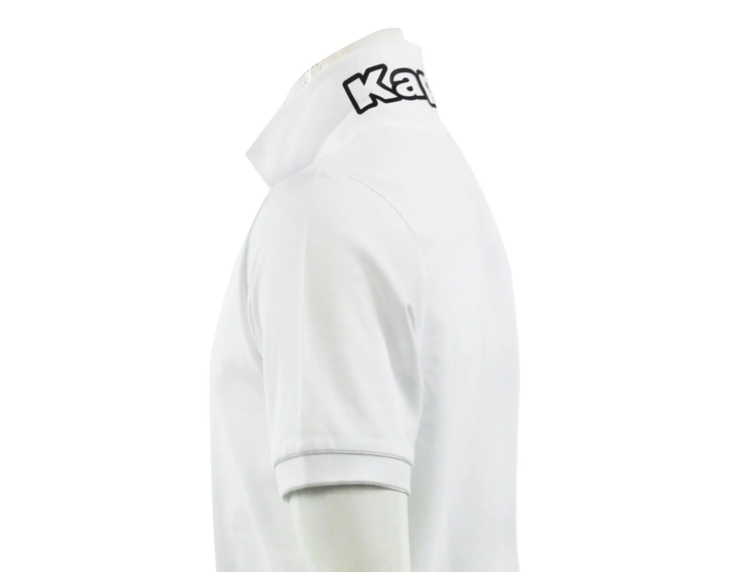 Weißes Poloshirt von Kappa. Das Poloshirt ist aus 100% Baumwolle und hat eine normale Passform. Das Polo hat einen gerippten Kragen, eine Knopfleiste und das Kappa Logo auf der Brust. Das Kappa Logo ist auch auf die Innenseite des Kragens gedruckt.
