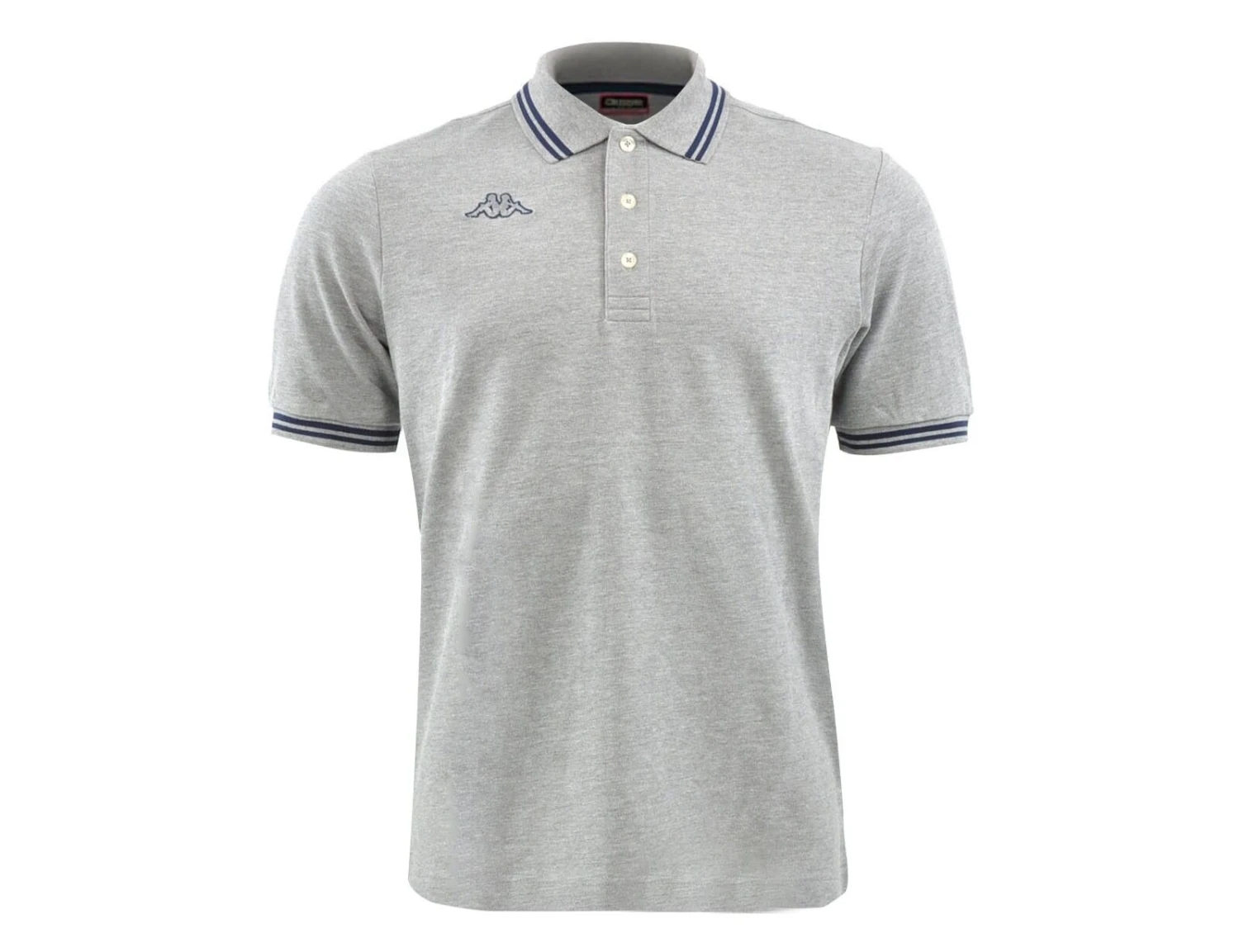 Graues Poloshirt von Kappa. Das Poloshirt ist aus 100% Baumwolle und hat eine normale Passform. Das Polo hat einen gerippten Kragen, eine Knopfleiste und das Kappa Logo auf der Brust. An den Ärmelbündchen und am Kragen sind Kontraststreifen.
