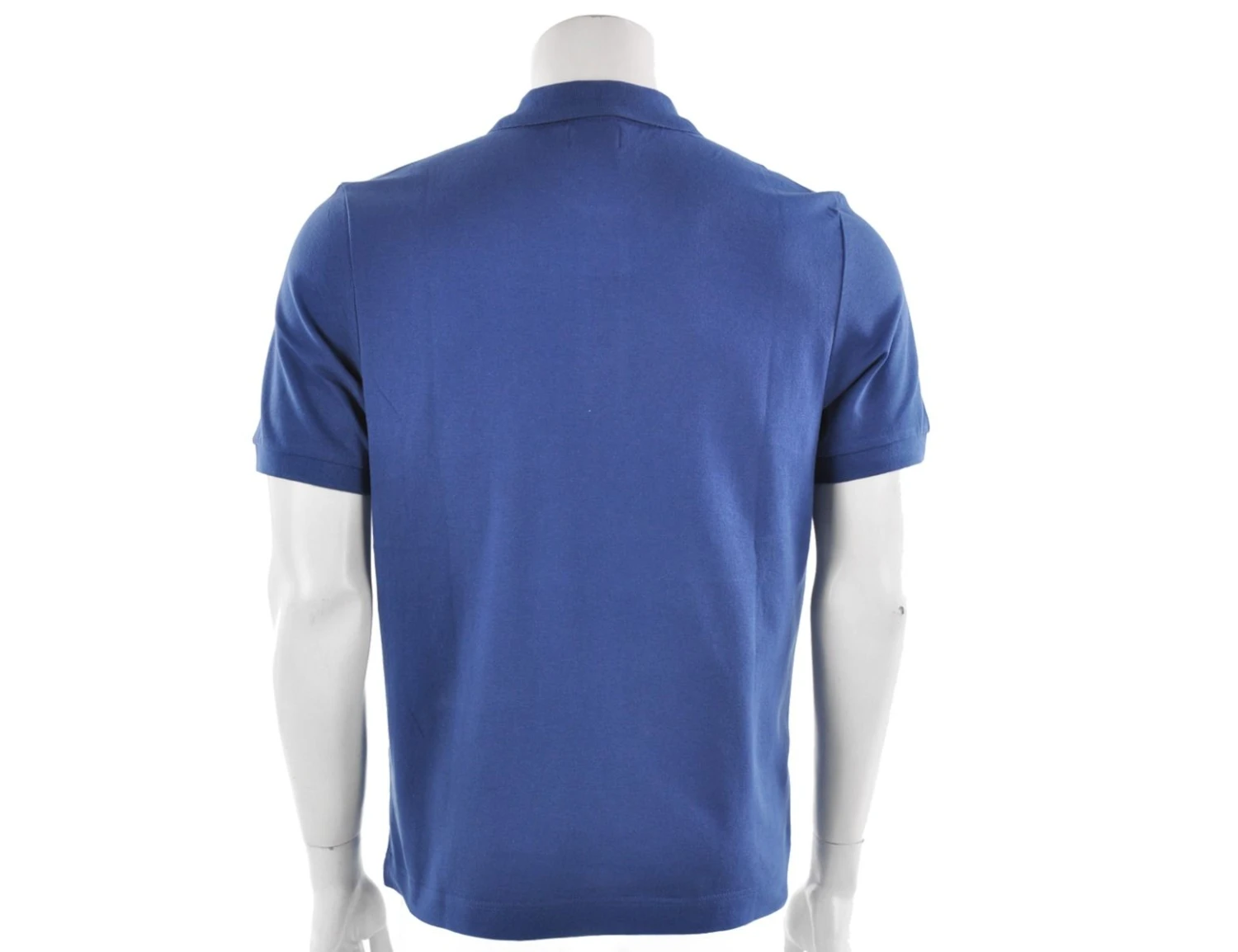 Das blaue Herren Poloshirt hat einen gerippten Kragen und eine Knopfleiste mit drei Knöpfen. Der Kappa Markenname ist auf dem Kragen. Das Poloshirt hat eine normale Passform.