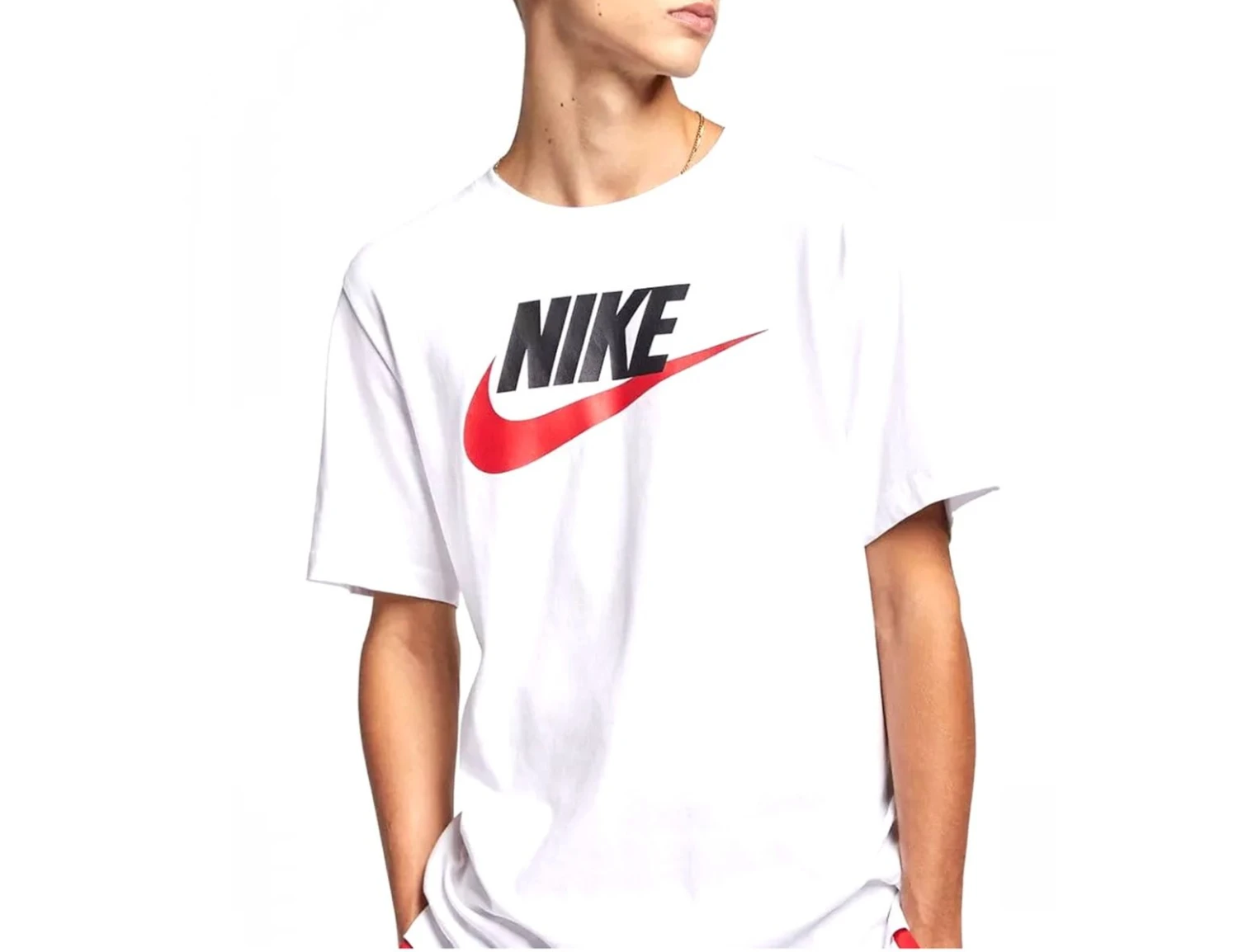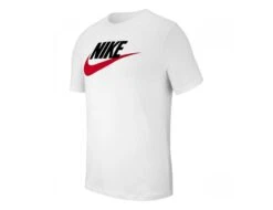 The white Nike Sportswear T-shirt has a classic look and is made of soft jersey cotton. The Nike Swoosh logo is printed on the chest in contrasting red. The shirt has a regular fit.